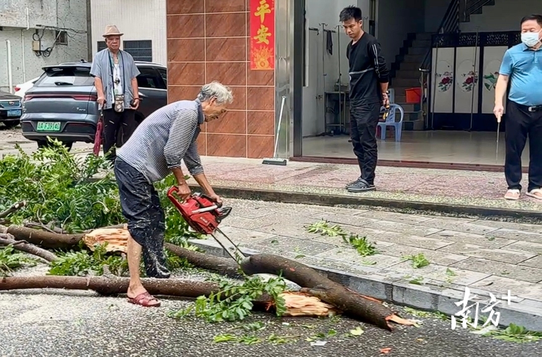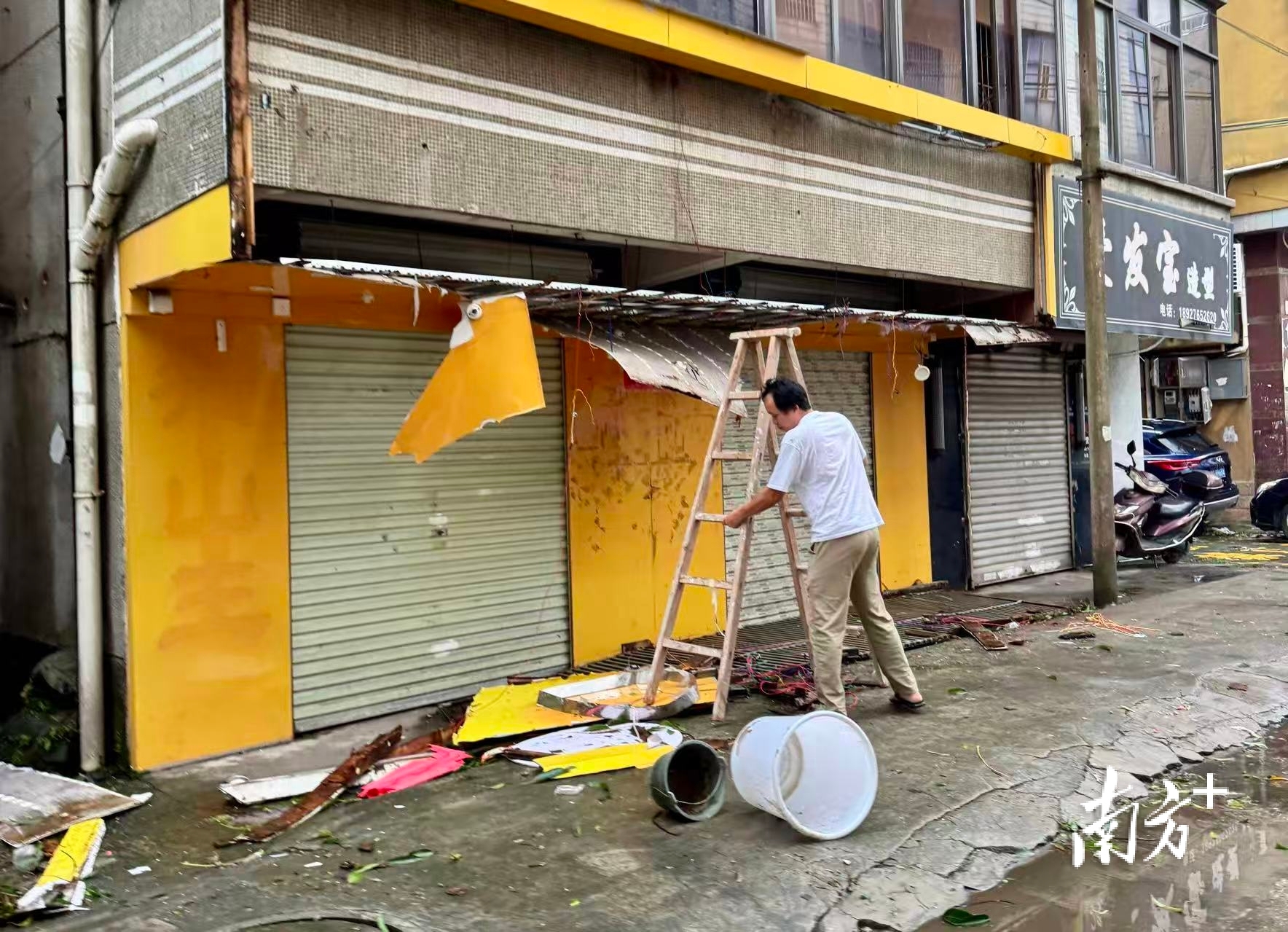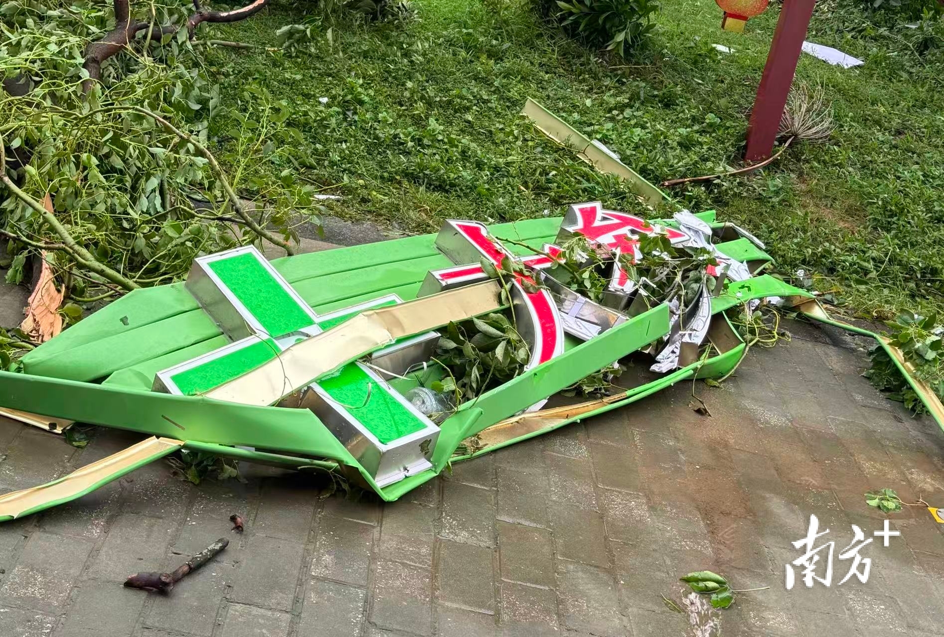 店肆招牌被吹散,湛江中工作人员将其搬出 南边+ 王越莹 拍照。县城